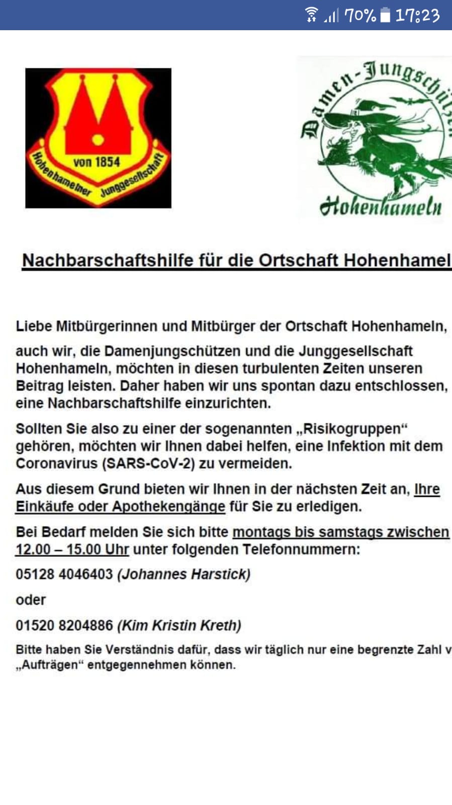 die Damenjungschützen und die Junggesellschaft aus Hohenhameln bieten Mitbürgern, die zur Risikogruppe bei einer Corona-Infektion gehören, Hilfe an.